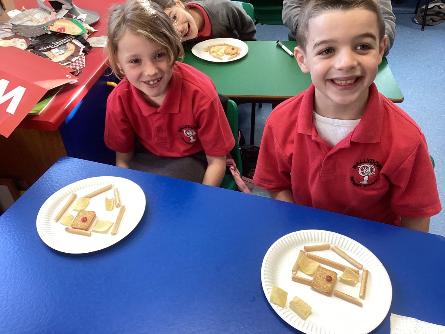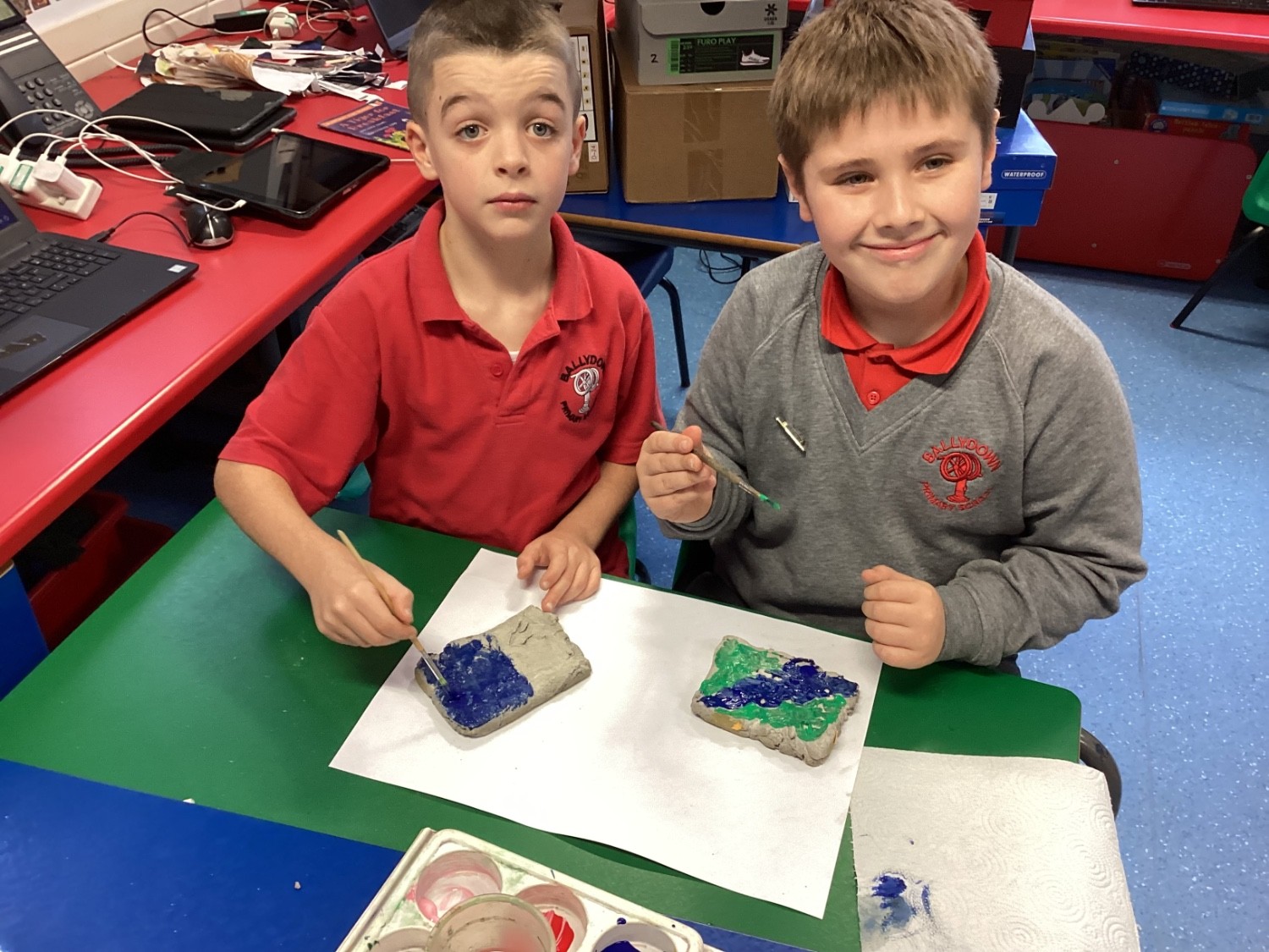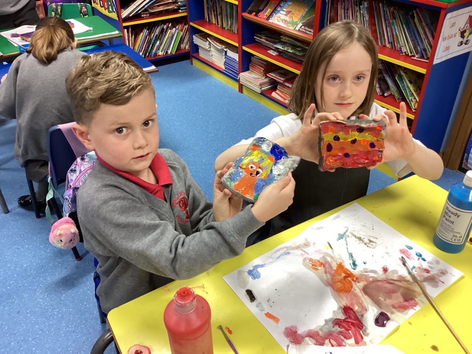 P4 have been busy finding out lots of interesting things about houses and homes. They have been observing their own homes. We have been discovering how houses are built. Lucy’s mum and dad very kindly came into school to tell lots of information. Mr Mackey was able to answer lots of questions about building a house for us. They also gave us lovely hats which helped us construct our shoebox houses. It has been fun using the beebot to program instructions to get beebot to travel to different houses. Mrs Kelly did a fun food house with us too. We also made a brick, using sand, cement powder and water. P4 had great fun painting their unique brick.